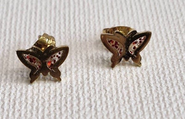 boucle d'oreille petit papillon doré plaquage or 1 micron, d'exellente qualité , rouge avec pailettes