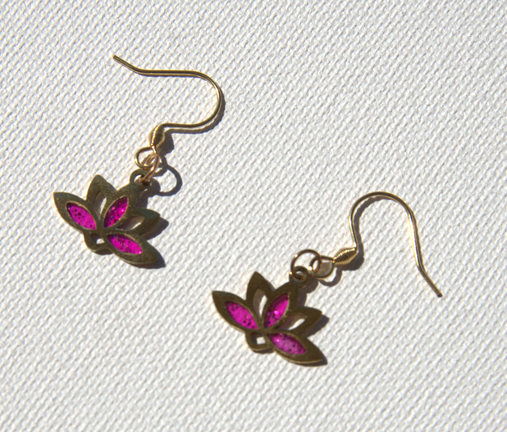 boucle d'oreille en acier inoxydable ,lotus plaqué or 18 carat veritable ,14x18.5x1mm et resine rose